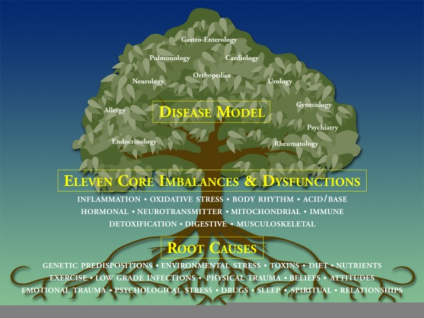 Functional medicine is alternative medicine that combines the philosophy of balance and how to restore function from our known bioenergies with the knowledge of biochemistry and physiology. Functional medicine uses the latest scientific research about how our genetics, environment and lifestyle all interact with each other. Functional medicine focuses assessment and intervention at the root levels of metabolic imbalance and is an evolution that addresses the healthcare needs of the 21st century by focusing on prevention and uncovering the underlying causes of serious chronic disease. Instead of just suppressing symptoms, it deals with the root causes of illness and is less concerned with making a diagnosis and more concerned with the underlying imbalances, which are the mechanisms of the illness process.